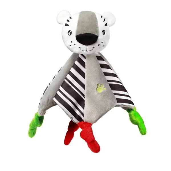 OPIS NAZWA PRODUKTU:Przytulanka dla niemowląt –kocyk TIGER RICHARD 642TYGRYS RICHARD –to prawdziwyobrońca,którylubi bliski kontakt. Rzadko ustępuje miejsca zajmując najlepszą pozycję do tulenia.Uśmiechnięty, kontrastowy, z kolorowymi supełkami zachęca maleństwo do przytulania i wspólnej zabawy. Rozwija umiejętności poznawcze imoże stać się pierwszym najlepszymprzyjacielem każdego dziecka. Tygrys Richardjest częścią kolekcji C: MORE, liczącej14 zabawek, która powstała w dbałości o rozwój psychomotoryczny stymulując zmysł wzroku, dotyku, słuchu. Dzięki zabawkom z najnowszej kolekcji pozwalamy dzieciom zobaczyć więcej C: MORE.Świat według dziecka:•NOWORODEK –widzi to, co przed nim wyłącznie w czerni i bieli w bliskiej odległości•3 MIESIĄCE –zaczyna widzieć, rozpoznawać rodziców, kolory•8 MIESIĘCY –obraz staje się bardziej klarowny, koordynacja ruchu oko-ręka•12 MIESIĘCY –widzi wyraźnie w kolorach, jednak w pełni rozwinięty wzrokosiąga w wieku 2 latWłaściwości:•rozwój -subtelne dźwięki grzechotania pobudzają ciekawość, zachęcają do zabawy i kształtująwyobraźnię dziecka•przyjazna forma -miękkie materiały są idealne dla delikatnych i małych rączek dziec-ka•funkcja przytulanki, grzechotki i kocykaDane techniczne:•Materiał: 100% poliester •Wymiary:szer. 16 cm x wys. 25 cm x gł. 7cm•Waga:0,05kg