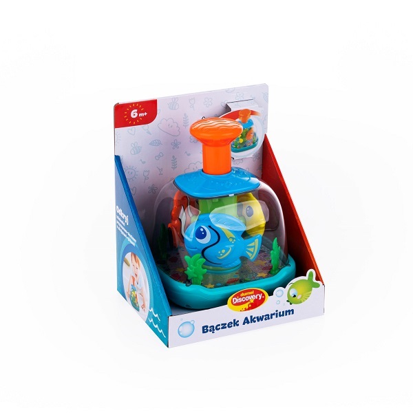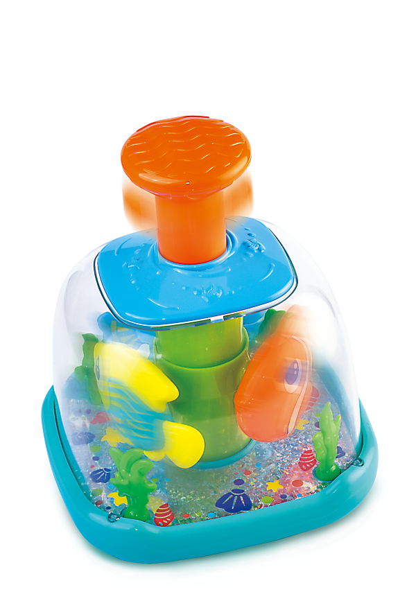 Wirująca zabawa w podwodnej odsłonie! Ten wesoły bączek jest wypełniony rybkami i morskimi roślinkami. Im szybciej maluch będzie wciskał pomarańczowy tłok, tym szybciej będą się kręcić rybki. Nasadę bączka i tłok zdobią wypukłe wzory, idealne do eksplorowania małymi rączkami.
