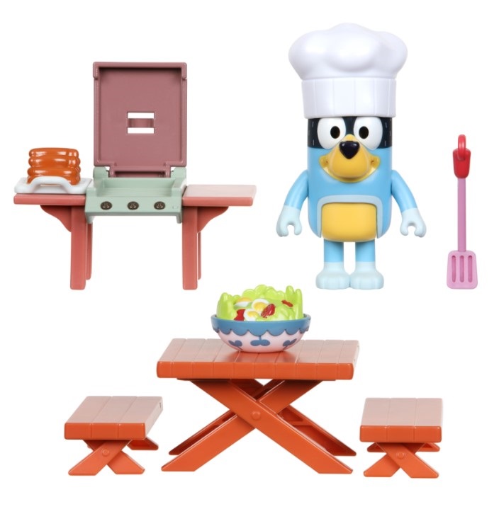 Wprowadź tę wesołość i kreatywność do swojego domu z mini-zestawem Podwórka Taty Bluey! Bandit (tata Bluey) jest mistrzem grilla BBQ i uwielbia przygotowywać pyszny obiad dla swojej rodziny. Ubrany jest przy tym w swój fartuch oraz czapkę kucharza i jest unikatową figurką dostępną jedynie w tym zestawie. Posiada nawet szpachelkę, dzięki której może obracać jedzenie na grillu! Zestaw zawiera grill BBQ, stół piknikowy, 2 ławki oraz 3 pyszne porcje jedzenia!