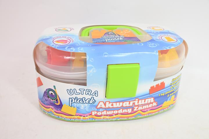 Teraz Ultra piasek w wygodnej i poręcznej walizce, imitującej akwarium, która mieści aż 1 kg piasku, 6-8 foremek oraz 2 narzędzia. Zabawa piaskiem jeszcze nigdy nie była tak wciągająca! UltraPiasek zachowuje swoje właściwości i nadaje się zarówno do zabawy na sucho, jak i wodzie. Uformowany, zachowuje swój kształt! To fantastyczna zabawa antystresowa, która zapewni dzieciom niezwykłe doznania sensoryczne. Łatwo się sprząta i nie pozostawia plam. Najlepsze właściwości uzyskuje w temperaturze ok. 26 stopni C.