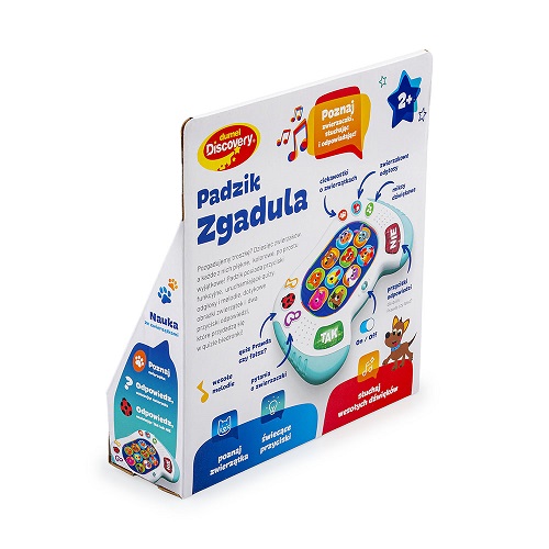 Pobaw się ze zwierzątkami w zgadywanki! Ten kompaktowy padzik wyposażony jest w kolorowe przyciski. Znajdziemy tu guziczki z podobiznami zwierzątek oraz przyciski aktywujące tryb zabawy: ciekawostki o zwierzątkach, dźwiękowe niespodzianki, takie jak zwierzęce odgłosy, dźwiękowe miksy czy wesołe melodie, a także quiz biedronki, działający na zasadzie gry „prawda czy fałsz”. Aby udzielić odpowiedzi na usłyszane pytanie, należy nacisnąć jeden z podświetlanych guziczków: TAK lub NIE. Zabawka wyposażona jest w praktyczny przełącznik ON/OFF, co umożliwia jej wyłączenie po zakończonej zabawy.
