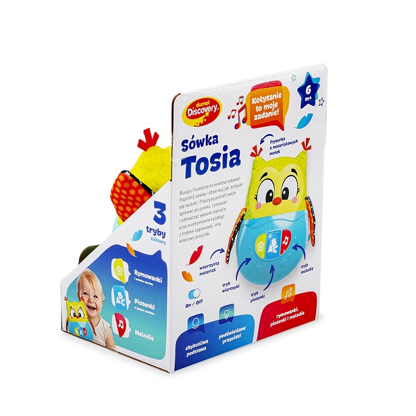 Rozkołysz się do zabawy razem z Tosią – rozgadaną sówką! Ptaszek buja się na swojej zabawkowej skorupce, bawiąc malucha dźwiękami. Tosia zna kilka krótkich rymowanek, potrafi także odtwarzać piosenki i melodie, a za uruchomienie poszczególnych dźwięków odpowiadają kolorowe przyciski na skorupce. Naciśnięcie kwiatka aktywuje tryb wierszyków, symbol ABC uruchamia piosenki w języku polskim, a nutka odtwarza wesołe melodie. Dzięki zaokrąglonej podstawie, sówka pięknie buja się na wszystkie strony. Wystarczy, że maluch pchnie ją do tyłu lub w bok, a Tosia zakołysze się i powróci do bazowej pozycji.
